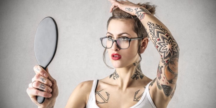Junge Frau mit Tattoos und Piercings betrachtet sich im Spiegel © freepik